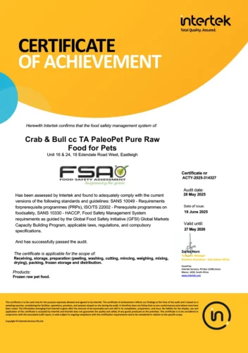 At PaleoPet Pure, we have an annual audit conducted by Intertek, this is an international organisation specialising in quality assurance certification. This means that the audits conducted are stringent and conform to international standards.